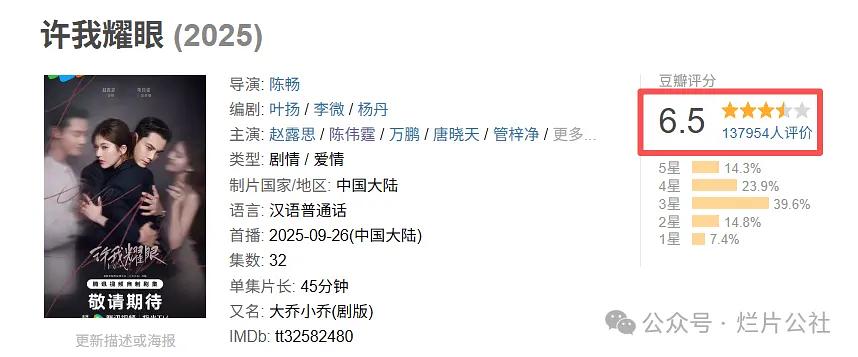 赵露思&陈伟霆领衔主演的《许我耀眼》豆瓣开分6.5分